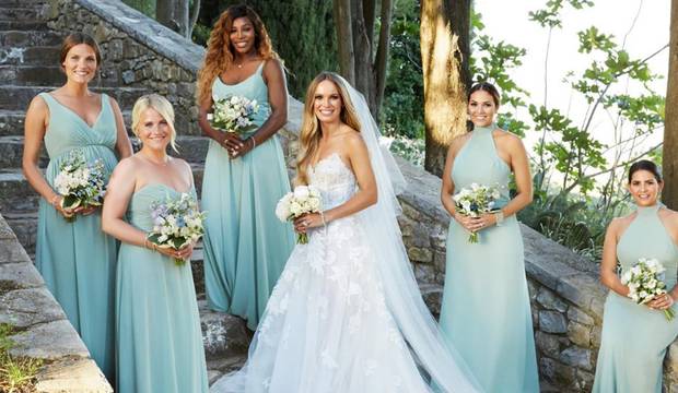 Wozniacki valgte å kle brudepikene sine i grønnsaker med havskum, en uventet farge, men et vakkert valg for hennes sommerbryllup. Og mens alle brudepikene hadde på seg kjoler i samme farge, ser det ut til at Wozniacki ga dem frihet til å velge sin egen silhuettstil. Williams hadde på seg en nappet kjole til nakene mens andre brudepiker valgte grime, stroppeløs og V-hals utseende. For å gå nedover midtgangen, holdt hver brudepike en bukett med blå, hvite og lilla blomster, og komplementerer fargen på brudepikekjolene perfekt.